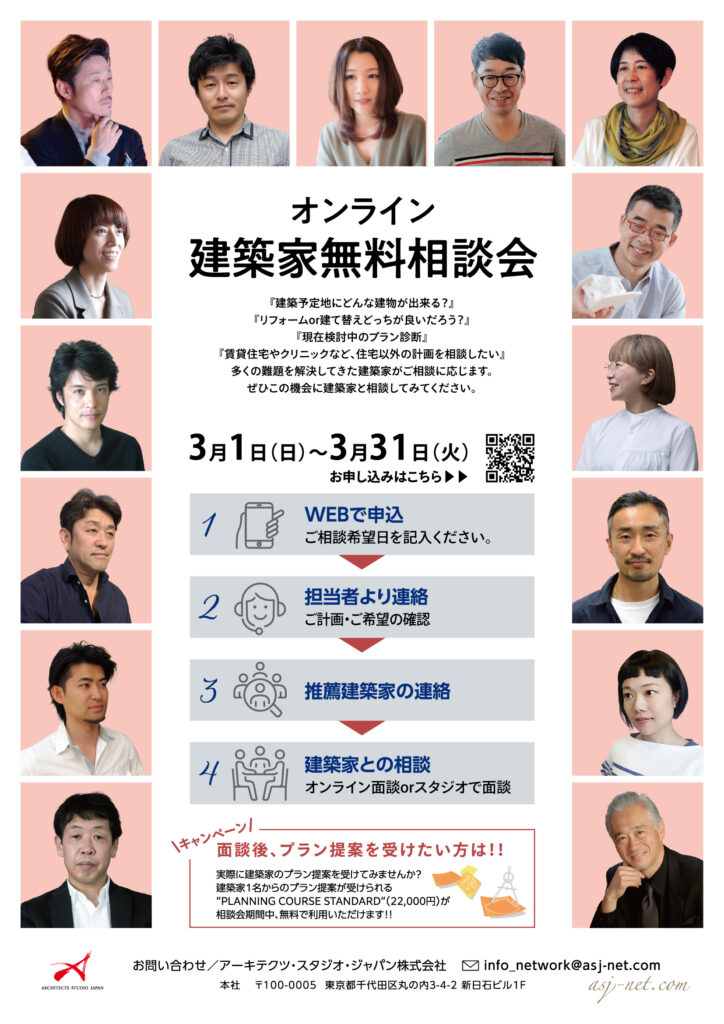 オンライン(ZOOM)にて、建築家がご相談に応じます。建設予定の敷地やリフォーム検討の物件がある方は、資料(図面や写真等)をご用意ください。多くの難題を解決してきた建築家がお答えします。